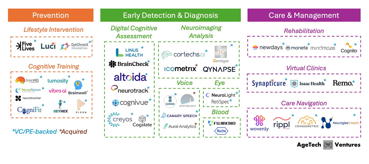 In this post, I map the Alzheimer’s technology landscape across the three stages of the journey: prevention, early detection & diagnosis, and care & management. The goal is practical: to understand what categories are emerging, what’s actually getting adopted in the field, and where the bottlenecks to adoption are.